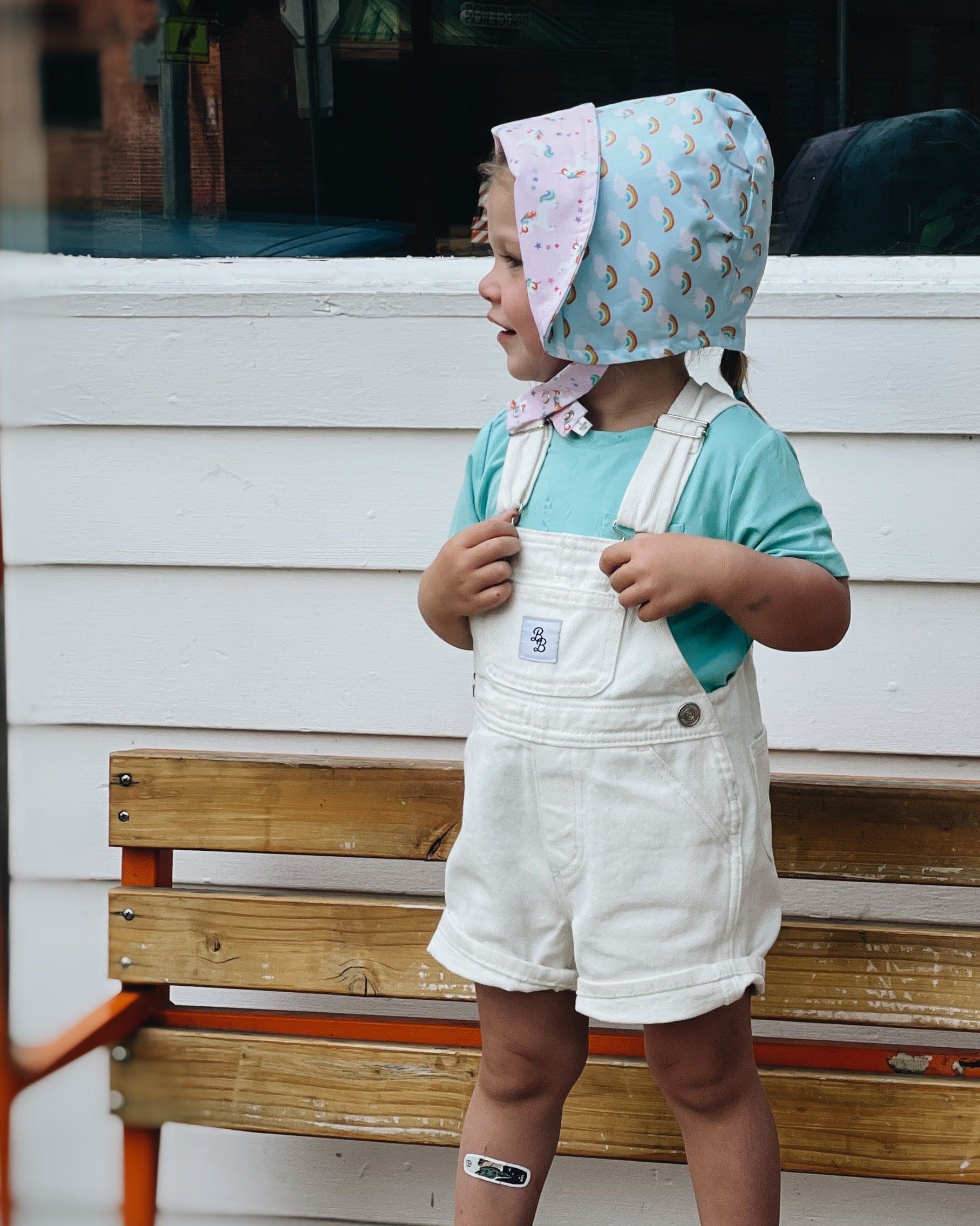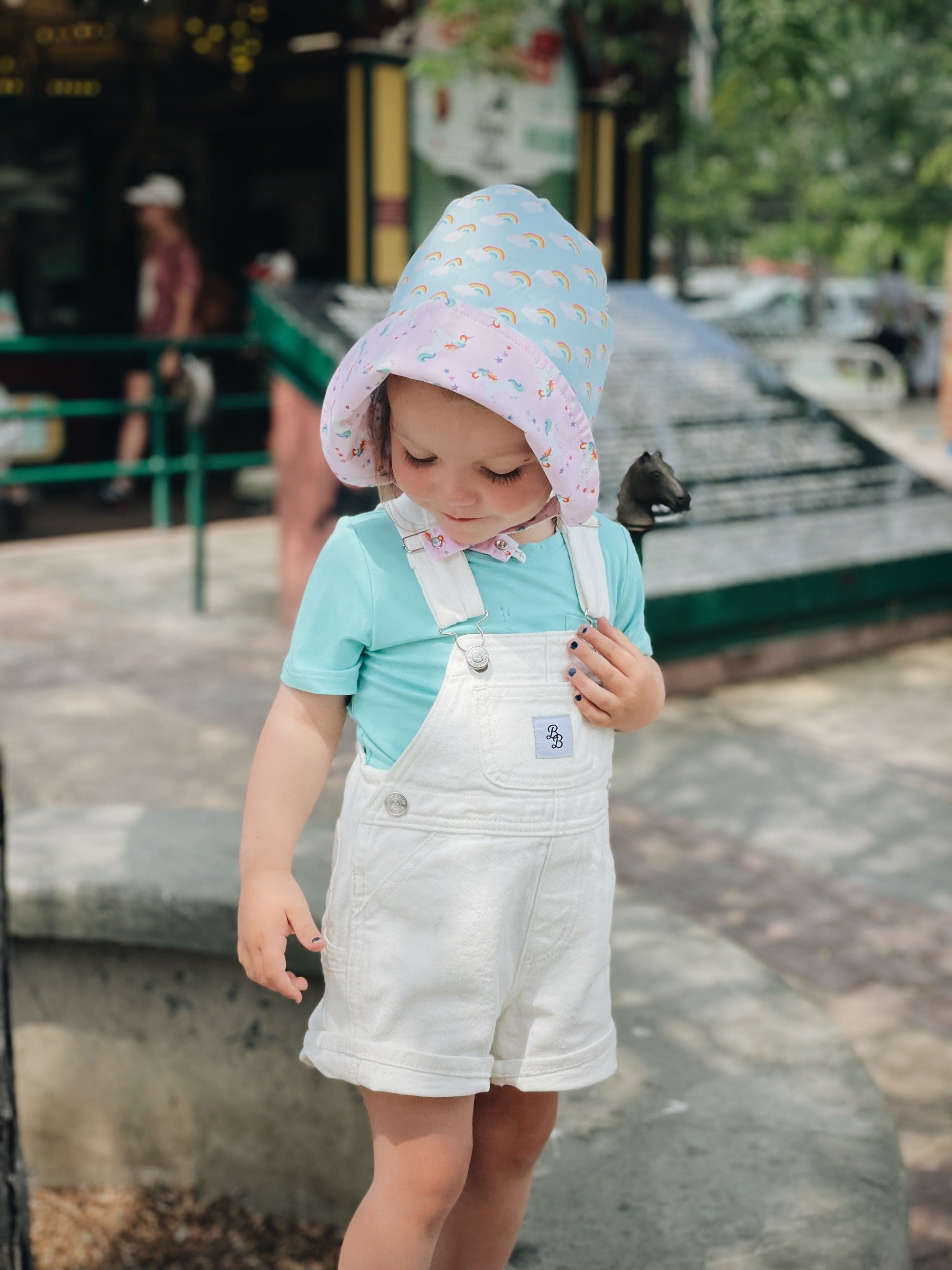 Stay covered, protected and dreamy in this Bonnet in Believe! Featuring rainbows, puffy clouds, unicorns, and our stellar UPF 50+ sun protection, it's perfect for a magical day outdoors. Machine washable for easy care, this bonnet is sure to make your little one even MORE adorable!