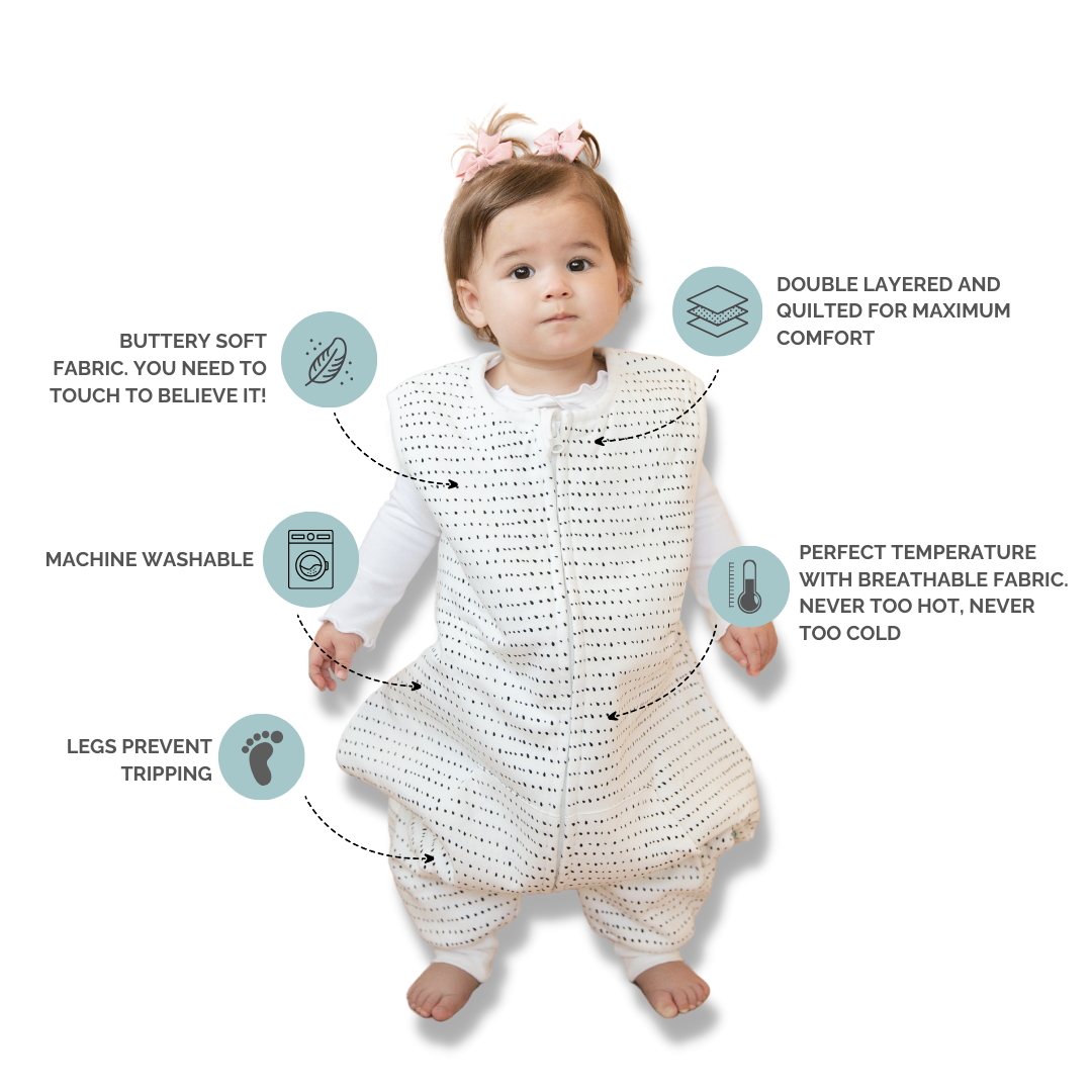 Toddler sleep sack with feet. A unique sleep bag with legs designed for active babies and toddlers, early walkers who trip and fall in their traditional sacks, and blanket kickers who wake up from the cold at night.