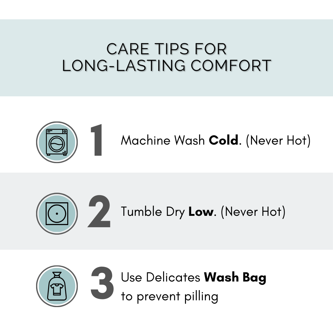 - Tumble Dry, Low Heat, Gentle Cycle