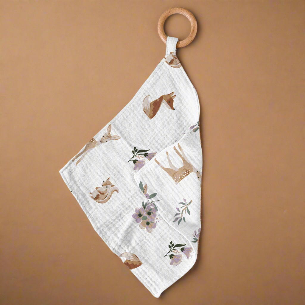 Adorable little Teether/ Blankie made from 100% cotton, with a removable beach wood ring for easy cleaning. Wood has natural antibacterial and antimicrobial properties, making wood a superior teether choice. This teether and blankie combo provides little ones gum relief along with a soothing square to snuggle up with!