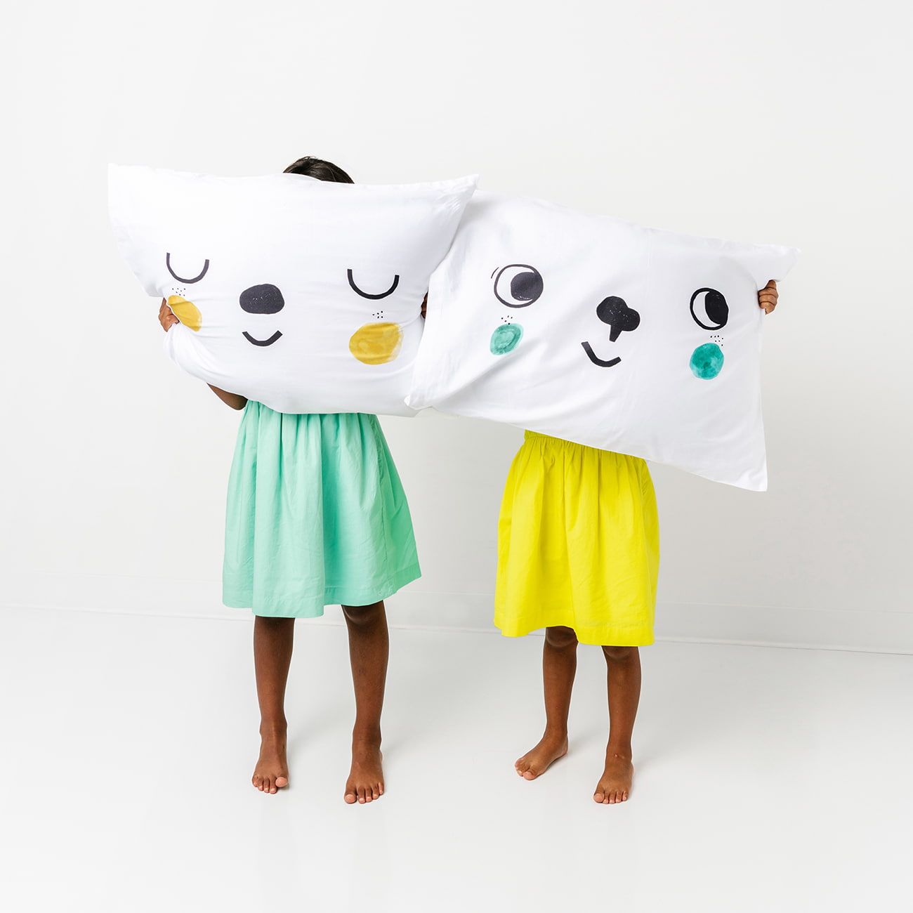 The set includes 2 pillowcases, with smiling faces and vibrant pops of color on the cheeks. The pillowcases have envelope closure to keep the pillow in place throughout all the tossing, turning and pillow-fighting.